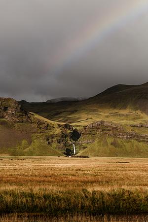 Iceland landscape with a beautiful rainbow over mountainous waterfall
